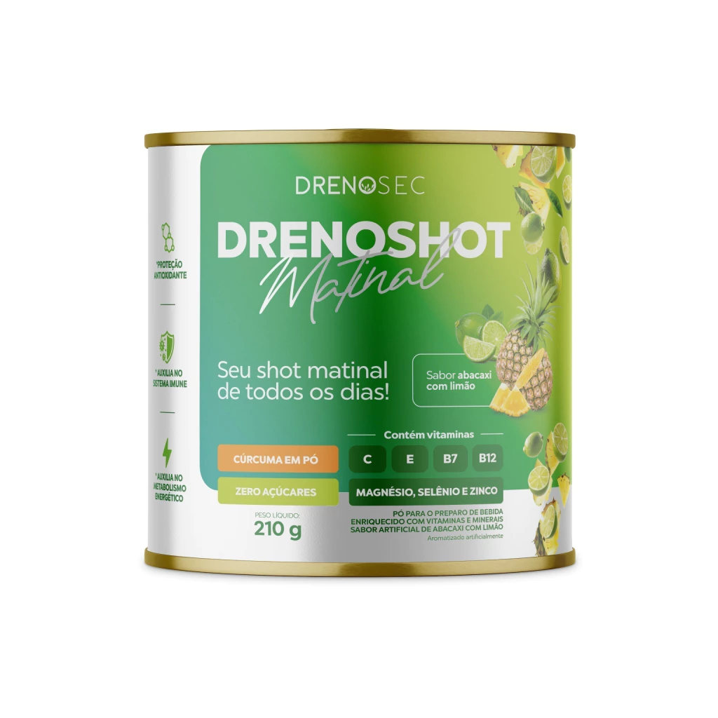 O DRENOSHOT é um shot matinal em pó com ingredientes naturais, zero açucar e muito saboroso, de alta performance que auxiliam o sistema imune, melhoram o equilíbrio digestivo e oferecem ação antioxidante. Uma dose completa para começar o dia com leveza, saúde e vitalidade.
